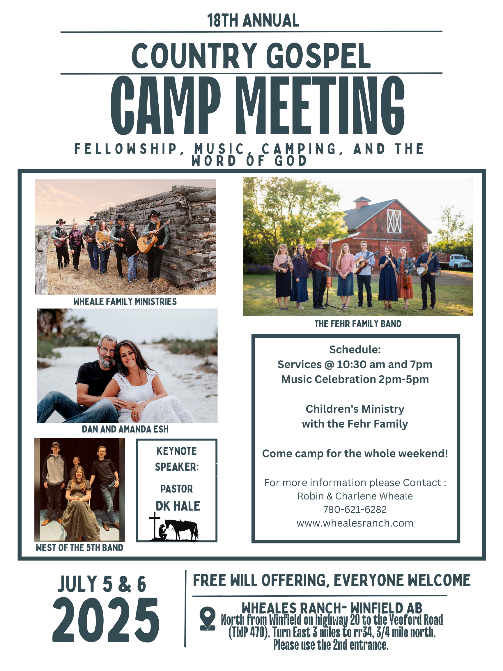 We strongly feel these events are more important now than ever, and are excited to be holding our 18th annual camp meeting July 5 & 6, 2025. Join us for the day or bring your trailer (or tent) and stay for the weekend. We are so excited to get together with you for a weekend of fellowship, music, campfires and fun.